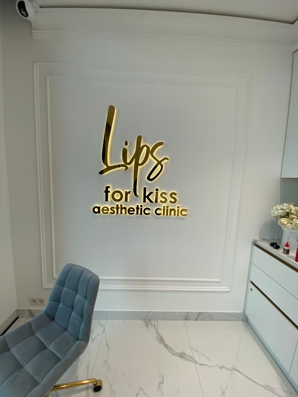 На встрече с клиентом уточнили размеры места установки, бюджет и требования к типу и дизайну объемных букв из металла. Вывеска «Lips for kiss aesthetic clinic» выполнена в современном стиле и идеально подходит для салона красоты. Она состоит из объемных металлических букв с светодиодной подсветкой, что делает её заметной как днём, так и ночью. Золотистый цвет букв придаёт изделию элегантность и подчёркивает премиальность бренда. Подсветка создаёт мягкий, приятный свет, который акцентирует внимание на названии клиники.